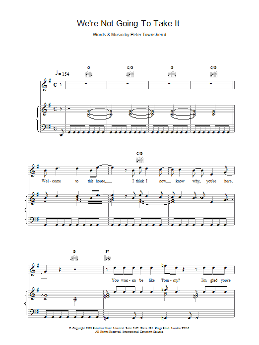 Download or print The Who We're Not Going To Take It sheet music, chords and digital score arranged for Piano, Vocal & Guitar Chords. This Musical/Show score includes 8 page(s).
