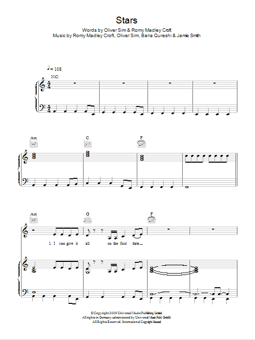 Download or print The XX Stars sheet music, chords and digital score arranged for Piano, Vocal & Guitar Chords. This Alternative score includes 7 page(s).