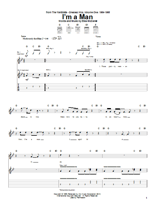 Download or print The Yardbirds I'm A Man sheet music, chords and digital score arranged for Easy Guitar Tab. This Blues score includes 3 page(s).