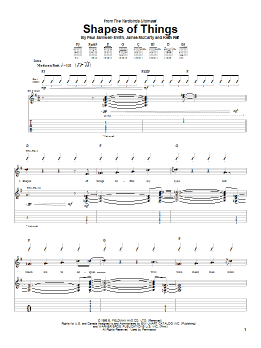 Download or print The Yardbirds Shapes Of Things sheet music, chords and digital score arranged for Guitar Tab. This Pop score includes 5 page(s).