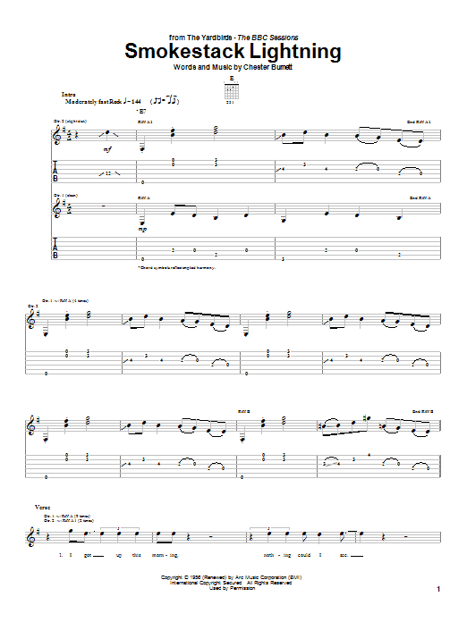 Download or print The Yardbirds Smokestack Lightning sheet music, chords and digital score arranged for Guitar Tab. This Blues score includes 9 page(s).