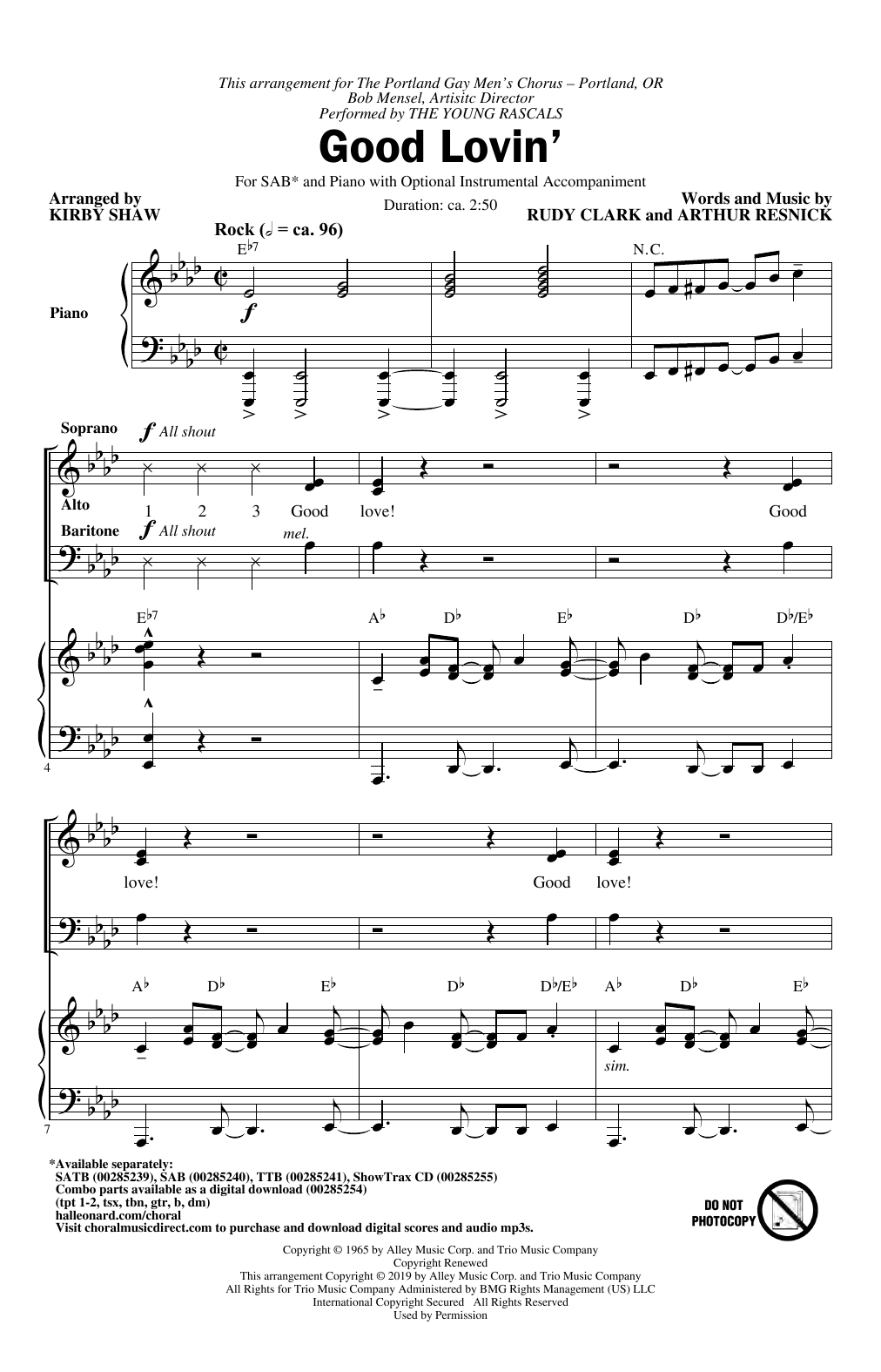 Download or print The Young Rascals Good Lovin' (arr. Kirby Shaw) sheet music, chords and digital score arranged for SAB Choir. This Rock score includes 14 page(s).