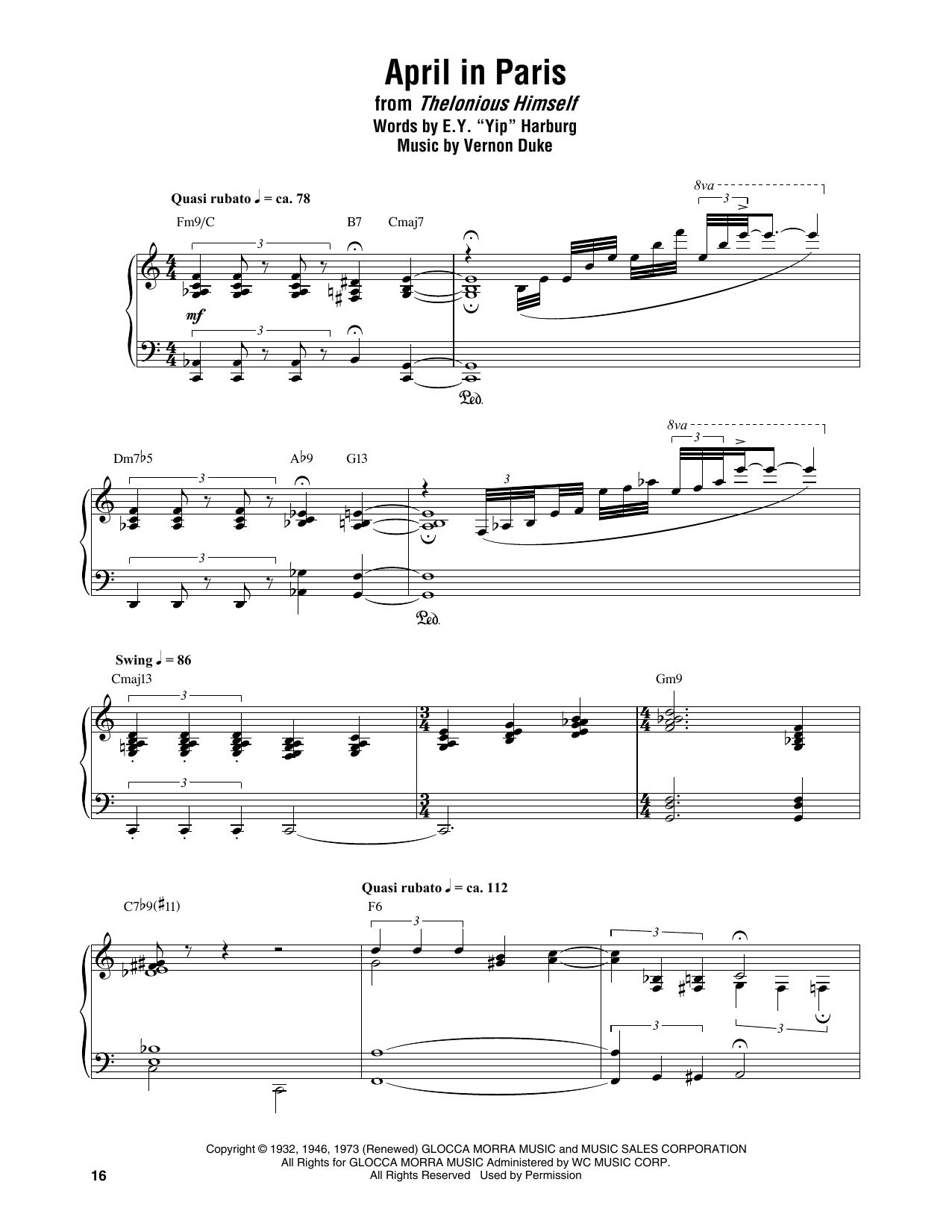 Download or print Thelonious Monk April In Paris sheet music, chords and digital score arranged for Piano Transcription. This Jazz score includes 6 page(s).
