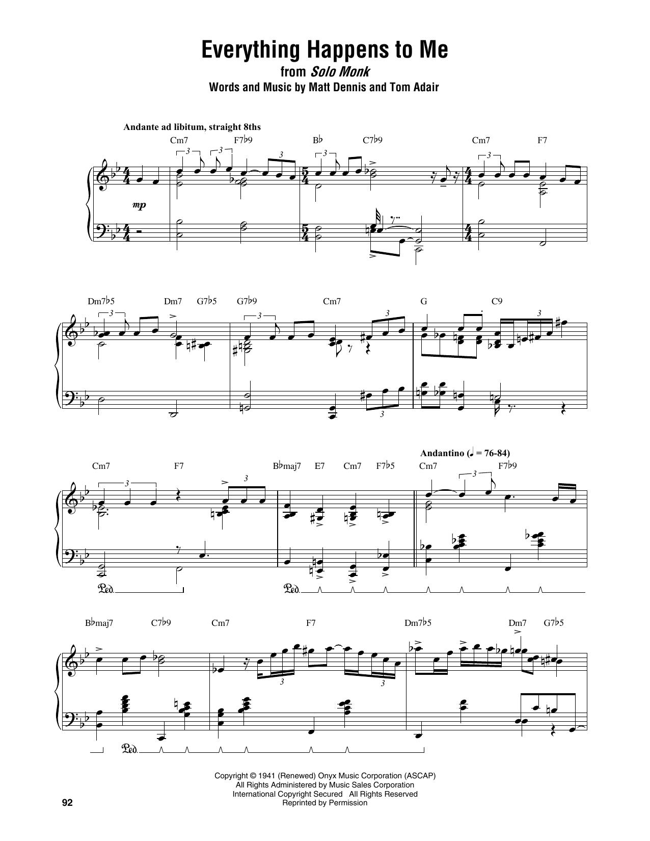 Download or print Thelonious Monk Everything Happens To Me sheet music, chords and digital score arranged for Piano Transcription. This Jazz score includes 5 page(s).