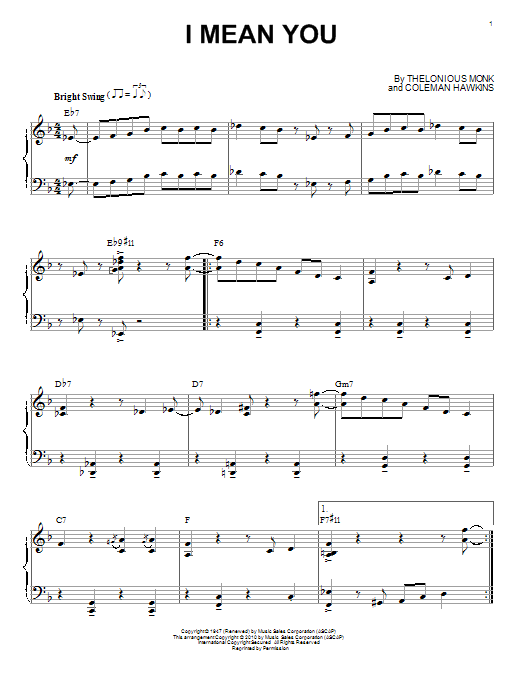 Download or print Thelonious Monk I Mean You (arr. Brent Edstrom) sheet music, chords and digital score arranged for Piano Solo. This Jazz score includes 5 page(s).