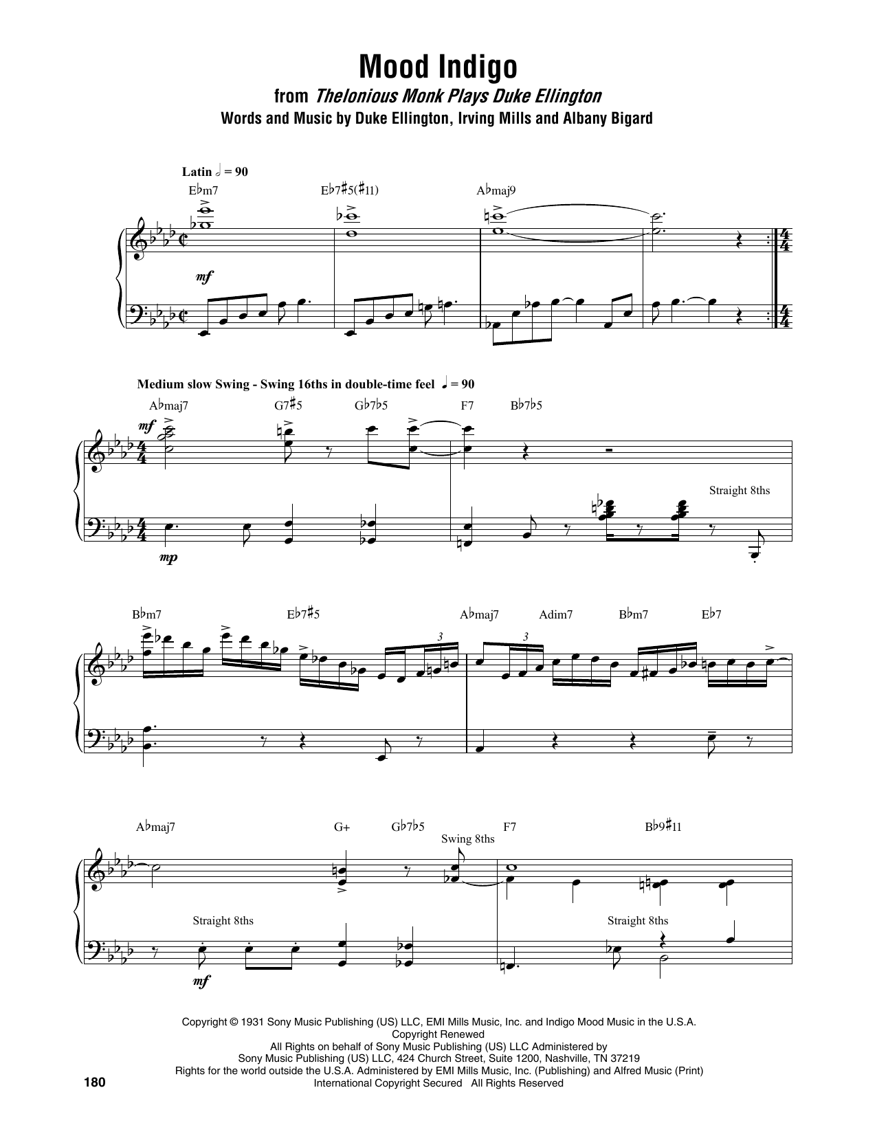 Download or print Thelonious Monk Mood Indigo sheet music, chords and digital score arranged for Piano Transcription. This Jazz score includes 6 page(s).