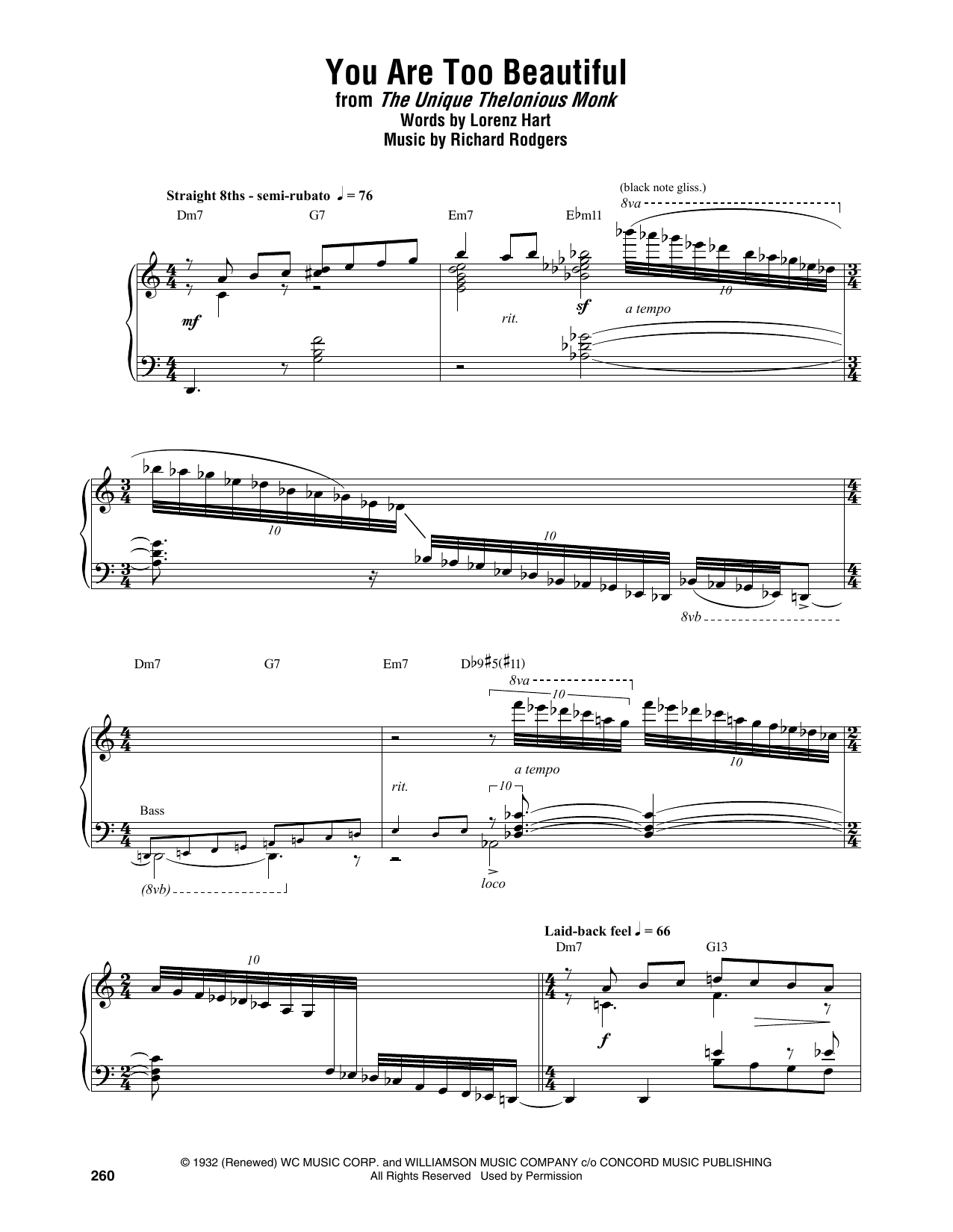 Download or print Thelonious Monk You Are Too Beautiful sheet music, chords and digital score arranged for Piano Transcription. This Jazz score includes 6 page(s).