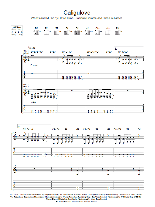 Download or print Them Crooked Vultures Caligulove sheet music, chords and digital score arranged for Guitar Tab. This Metal score includes 10 page(s).