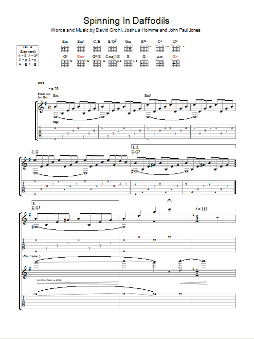 Download or print Them Crooked Vultures Spinning In Daffodils sheet music, chords and digital score arranged for Guitar Tab. This Metal score includes 15 page(s).