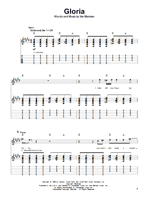 Download or print Them Gloria sheet music, chords and digital score arranged for Guitar Tab (Single Guitar). This Oldies score includes 7 page(s).