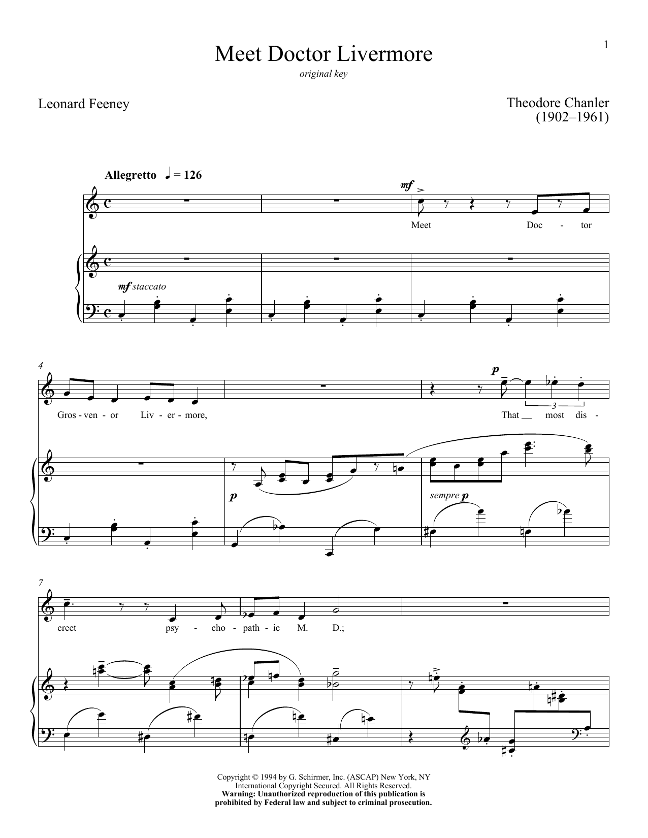 Download or print Theodore Chanler Meet Doctor Livermore sheet music, chords and digital score arranged for Piano & Vocal. This Classical score includes 4 page(s).