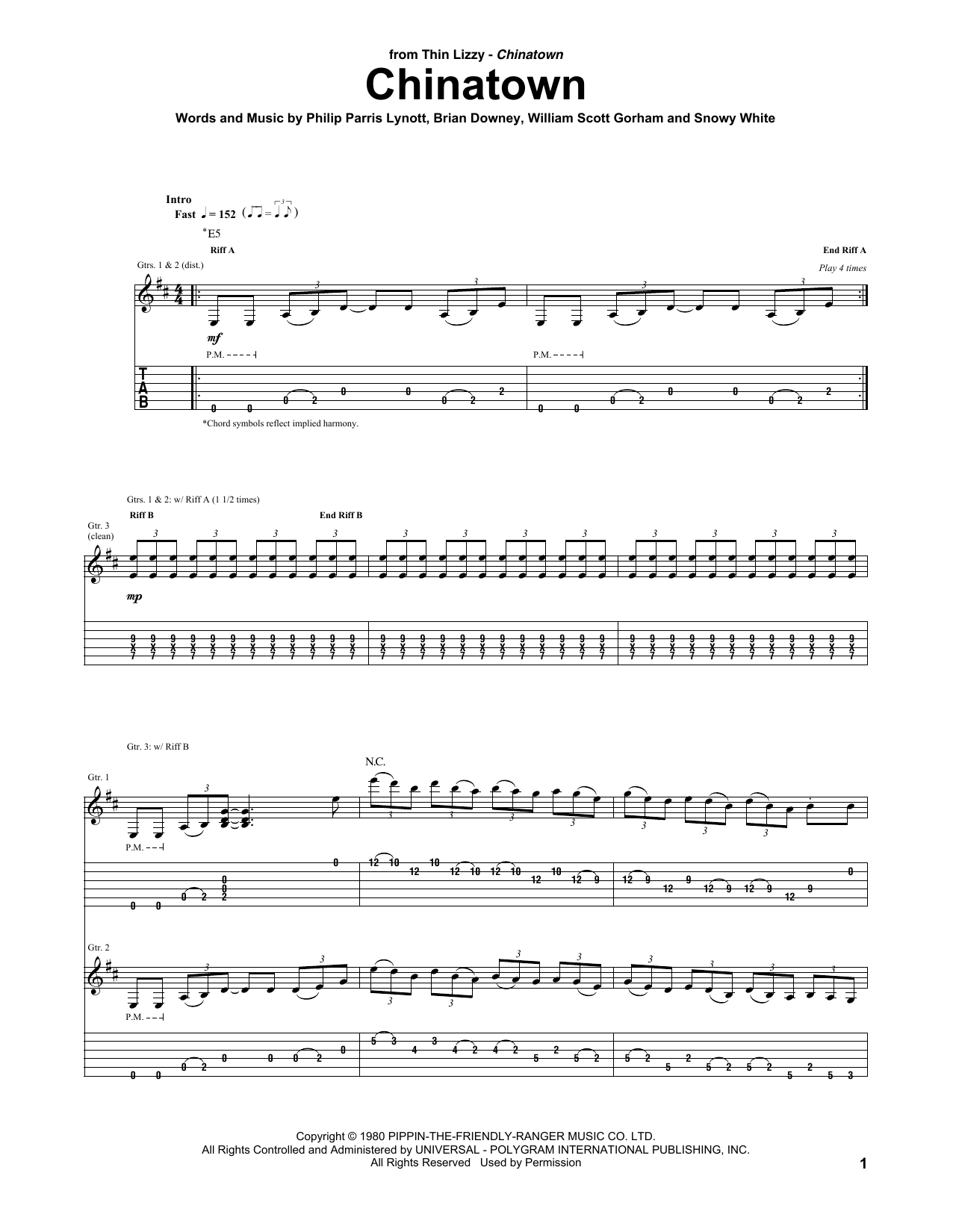 Download or print Thin Lizzy Chinatown sheet music, chords and digital score arranged for Guitar Tab. This Pop score includes 15 page(s).