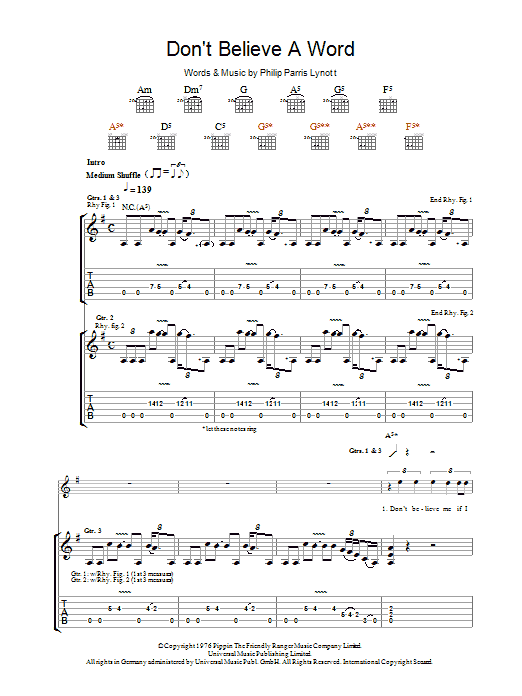 Download or print Thin Lizzy Don't Believe A Word sheet music, chords and digital score arranged for Guitar Tab. This Pop score includes 5 page(s).