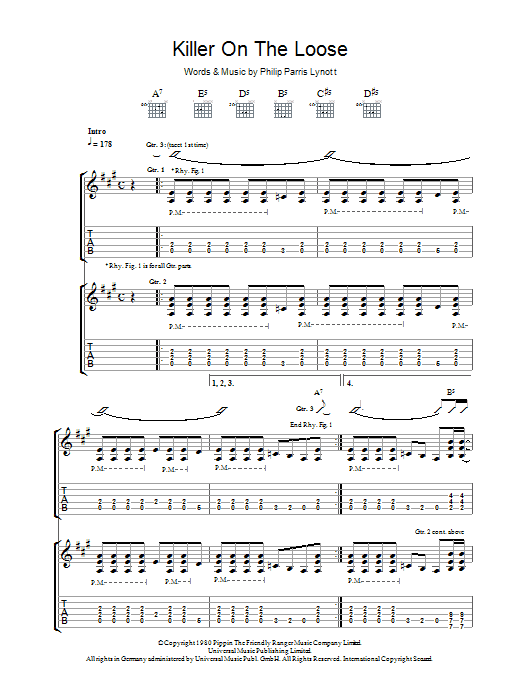 Download or print Thin Lizzy Killer On The Loose sheet music, chords and digital score arranged for Guitar Tab. This Pop score includes 7 page(s).