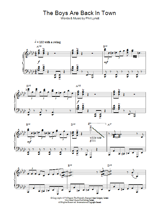 Download or print Thin Lizzy The Boys Are Back In Town (Jazz Version) sheet music, chords and digital score arranged for Piano Solo. This Jazz score includes 6 page(s).