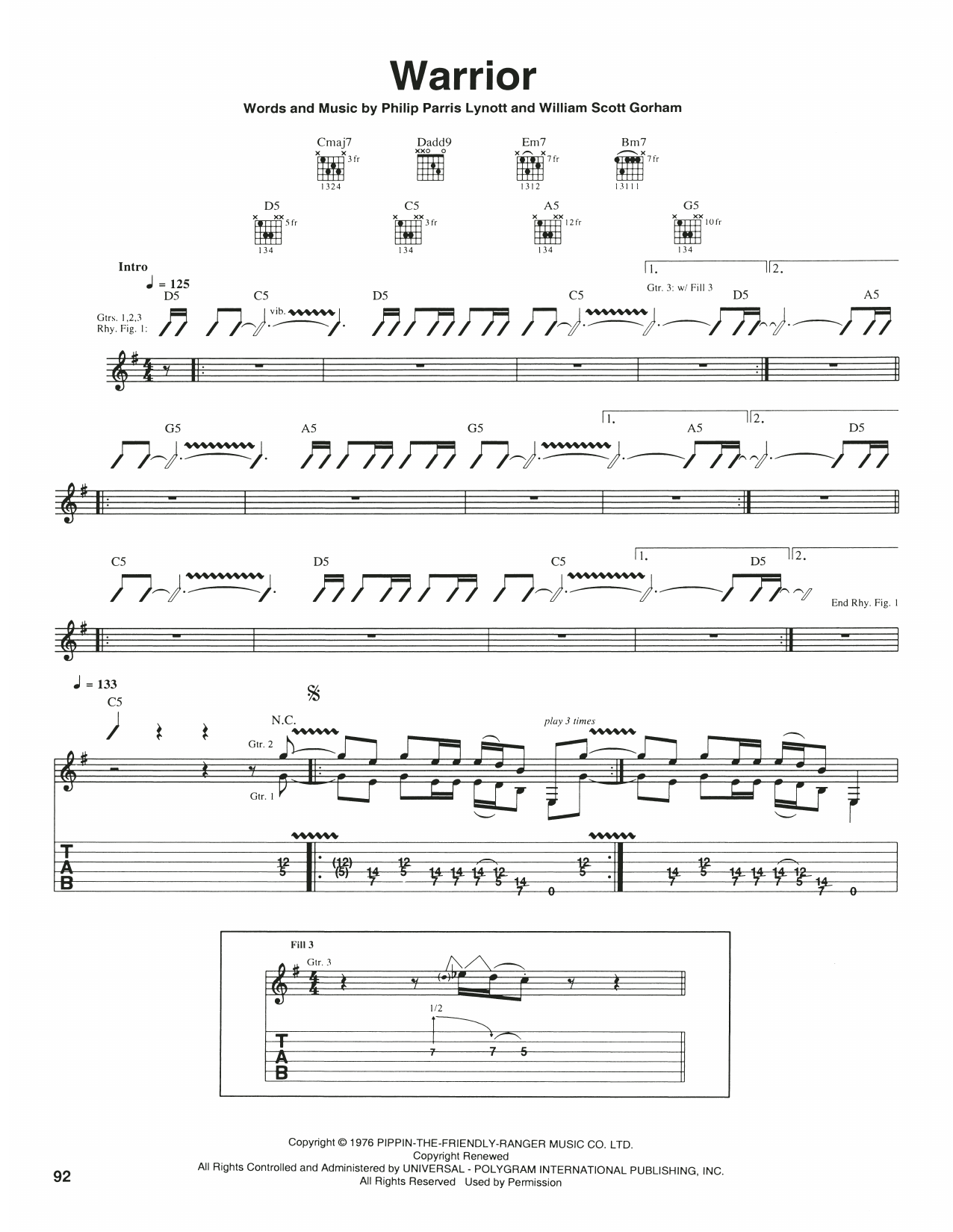Download or print Thin Lizzy Warrior sheet music, chords and digital score arranged for Guitar Tab. This Pop score includes 5 page(s).