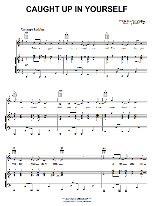 Download or print Third Day Caught Up In Yourself sheet music, chords and digital score arranged for Piano, Vocal & Guitar Chords (Right-Hand Melody). This Christian score includes 9 page(s).