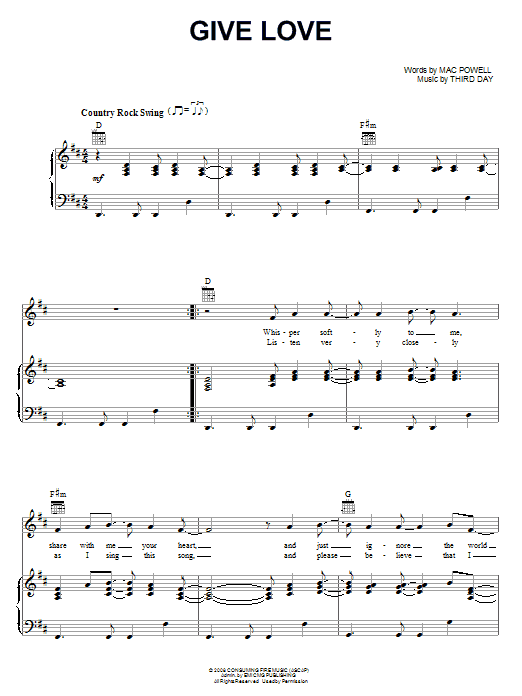 Download or print Third Day Give Love sheet music, chords and digital score arranged for Piano, Vocal & Guitar Chords (Right-Hand Melody). This Christian score includes 6 page(s).