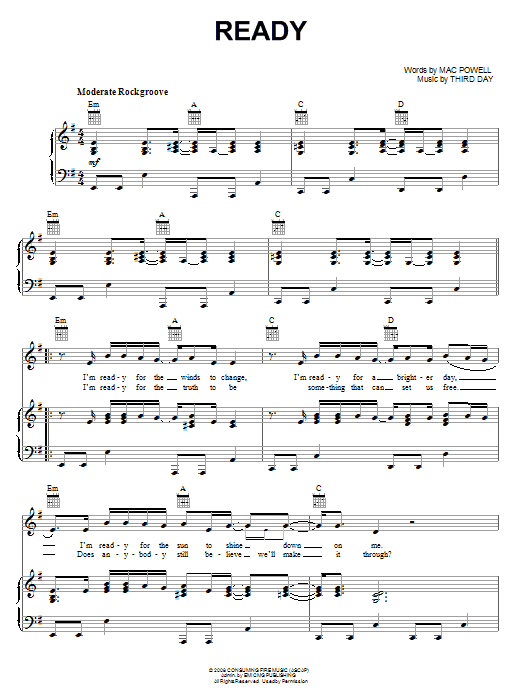 Download or print Third Day Ready sheet music, chords and digital score arranged for Piano, Vocal & Guitar Chords (Right-Hand Melody). This Christian score includes 6 page(s).