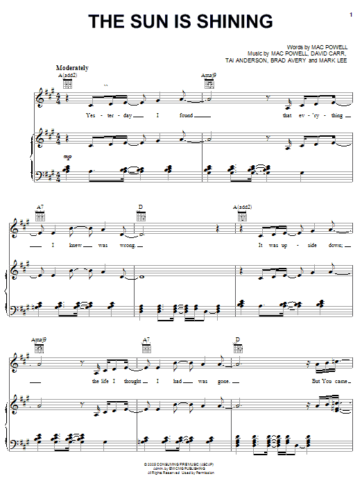 Download or print Third Day The Sun Is Shining sheet music, chords and digital score arranged for Piano, Vocal & Guitar Chords (Right-Hand Melody). This Christian score includes 7 page(s).