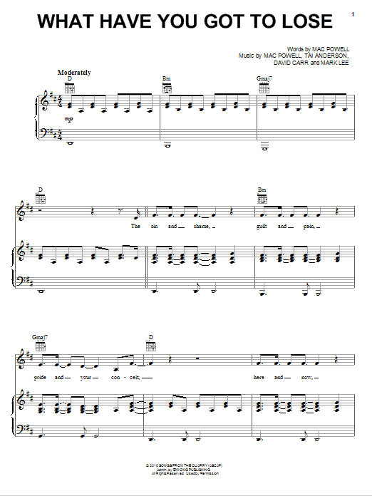 Download or print Third Day What Have You Got To Lose sheet music, chords and digital score arranged for Piano, Vocal & Guitar Chords (Right-Hand Melody). This Pop score includes 6 page(s).