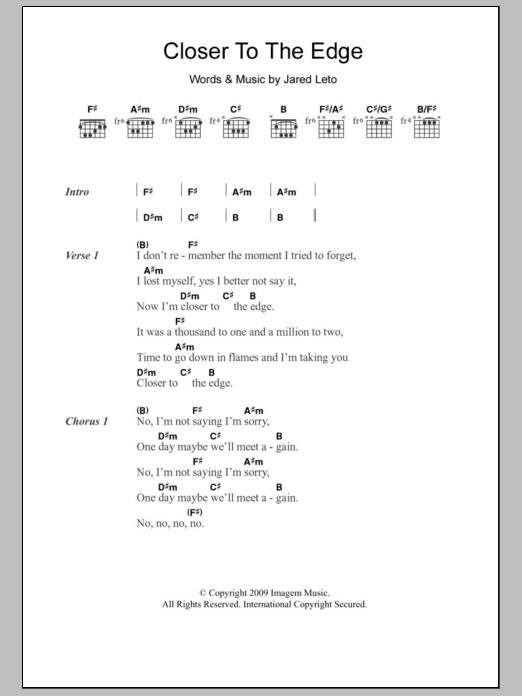 Download or print Thirty Seconds To Mars Closer To The Edge sheet music, chords and digital score arranged for Guitar Chords/Lyrics. This Rock score includes 3 page(s).