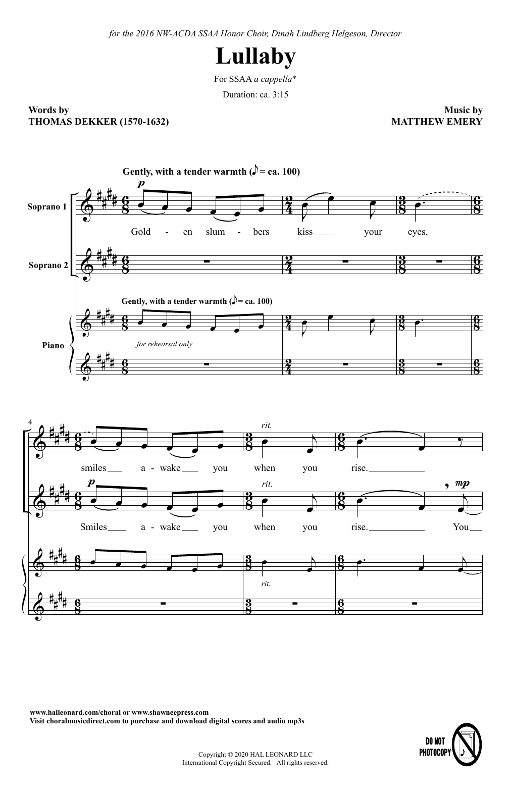 Download or print Thomas Dekker and Matthew Emery Lullaby sheet music, chords and digital score arranged for SSAA Choir. This Concert score includes 9 page(s).
