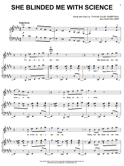 Download or print Thomas Dolby She Blinded Me With Science sheet music, chords and digital score arranged for Piano, Vocal & Guitar Chords (Right-Hand Melody). This Pop score includes 8 page(s).