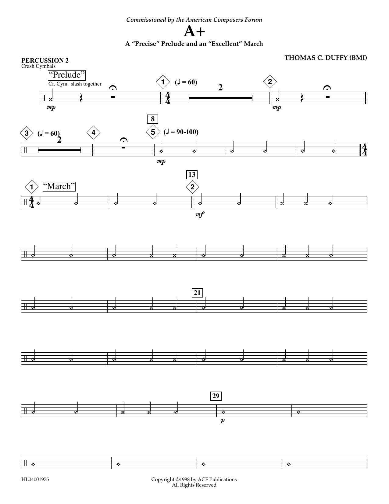 Download or print Thomas Duffy A+: A "Precise" Prelude and an "Excellent" March - Percussion 2 sheet music, chords and digital score arranged for Concert Band. This Concert score includes 2 page(s).