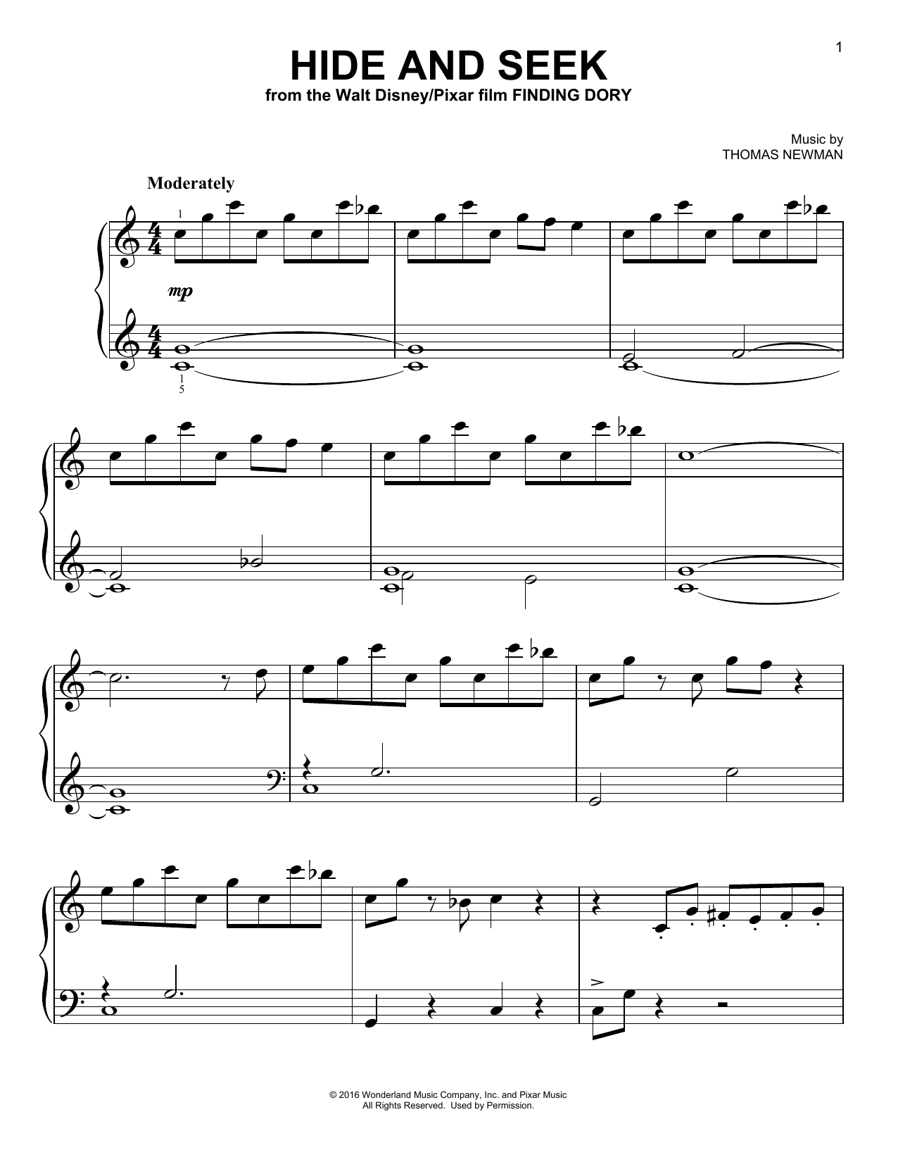 Download or print Thomas Newman Hide And Seek (from Finding Dory) sheet music, chords and digital score arranged for Piano Solo. This Children score includes 2 page(s).