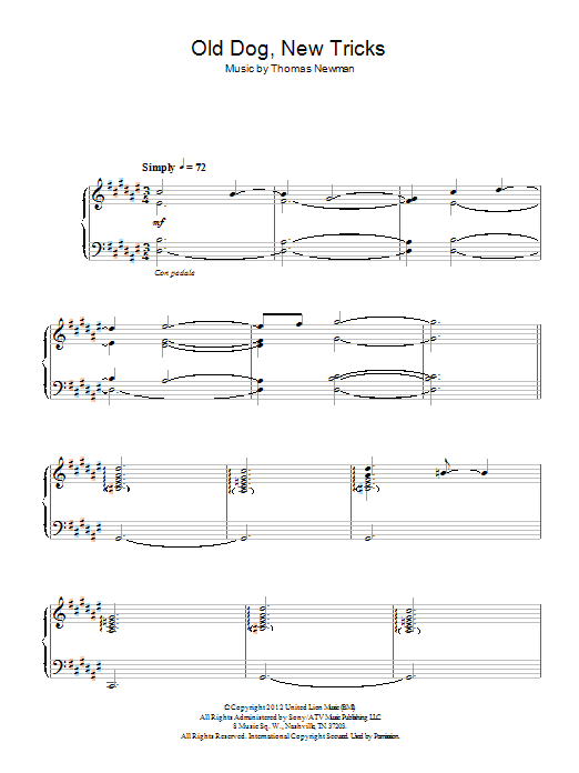 Download or print Thomas Newman Old Dog, New Tricks sheet music, chords and digital score arranged for Piano Solo. This Film/TV score includes 3 page(s).