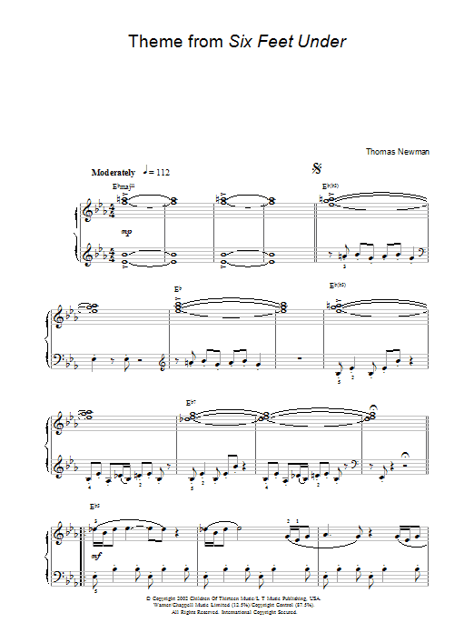 Download or print Thomas Newman Theme from Six Feet Under sheet music, chords and digital score arranged for Easy Piano. This Film/TV score includes 2 page(s).