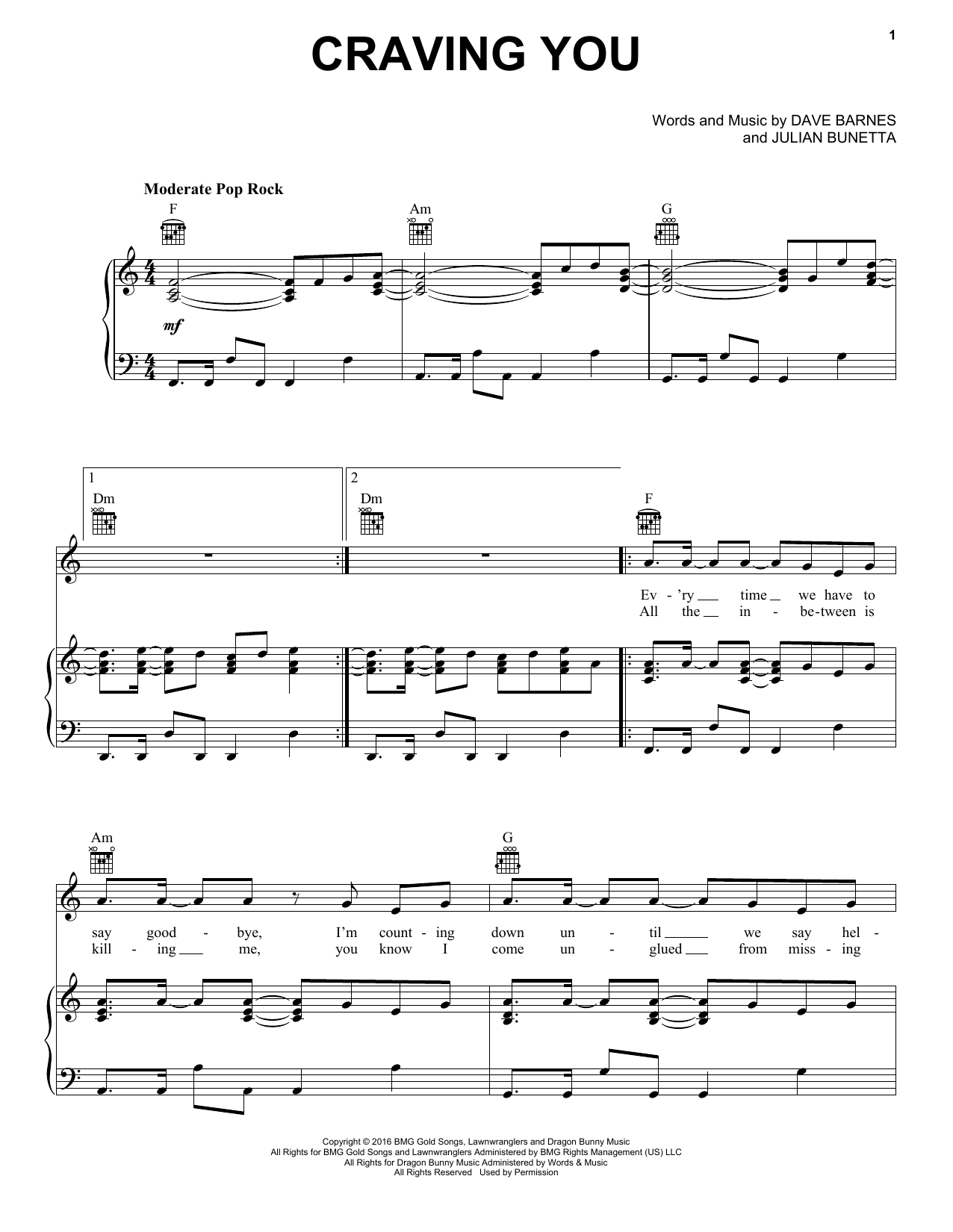 Download or print Thomas Rhett Craving You (feat. Maren Morris) sheet music, chords and digital score arranged for Piano, Vocal & Guitar Chords (Right-Hand Melody). This Pop score includes 5 page(s).