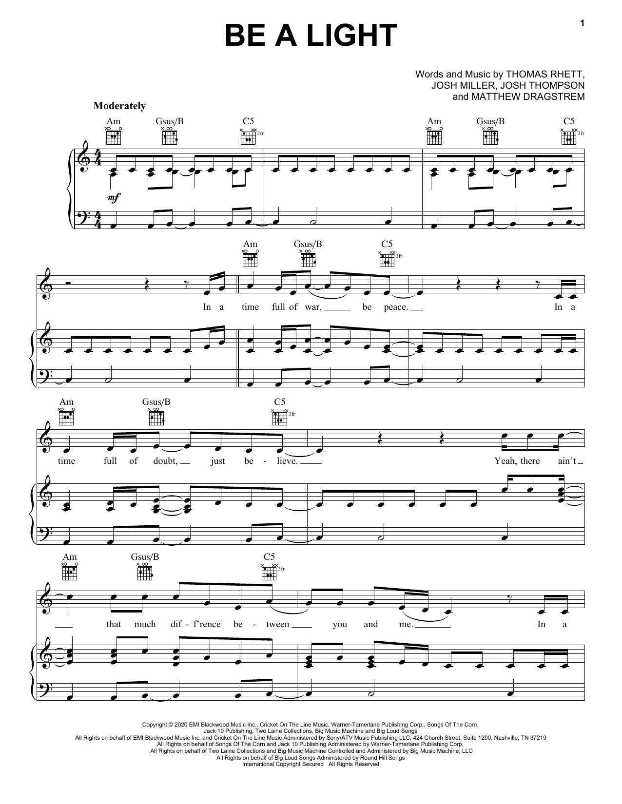 Download or print Thomas Rhett, Reba McEntire, Hillary Scott, Chris Tomlin and Keith Urban Be A Light sheet music, chords and digital score arranged for Piano, Vocal & Guitar Chords (Right-Hand Melody). This Country score includes 7 page(s).
