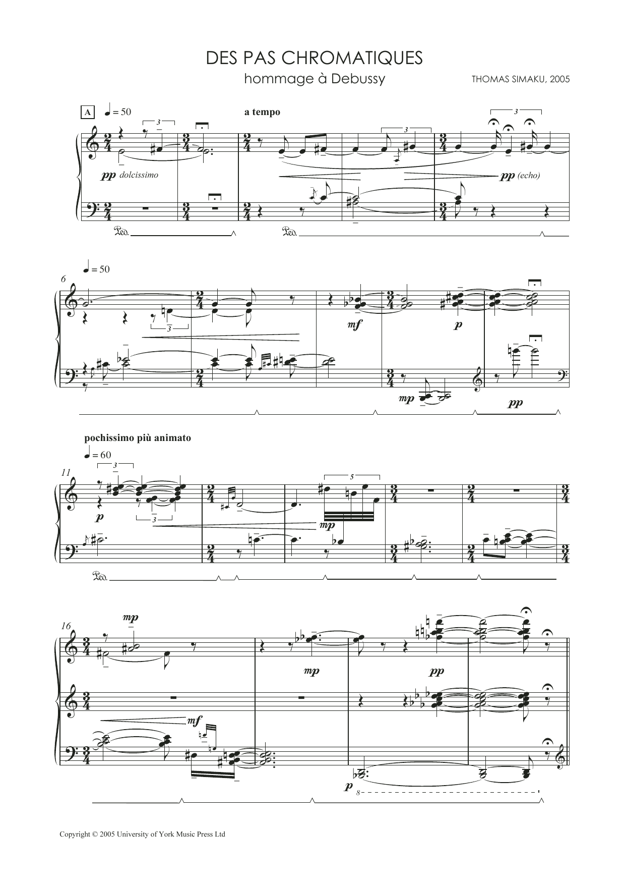 Download or print Thomas Simaku Des Pas Chromatiques - Hommage A Debussy sheet music, chords and digital score arranged for Piano Solo. This Classical score includes 13 page(s).