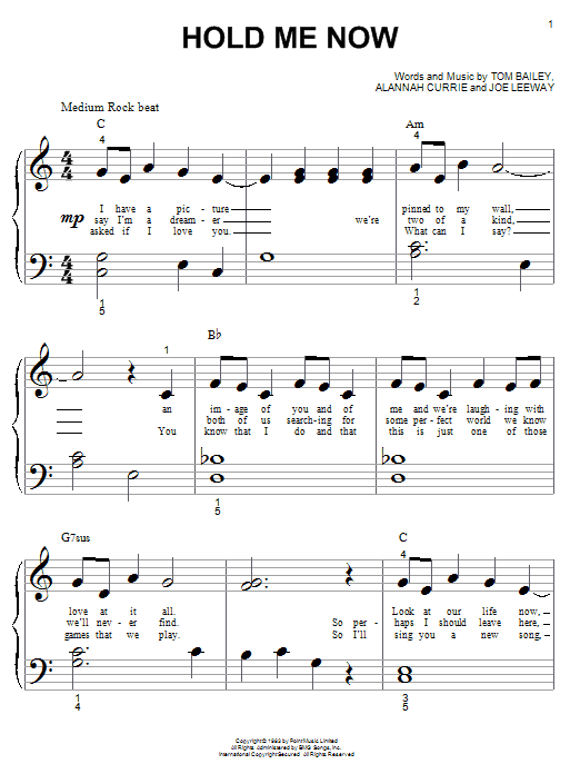 Download or print Thompson Twins Hold Me Now sheet music, chords and digital score arranged for Piano Solo. This Love score includes 4 page(s).
