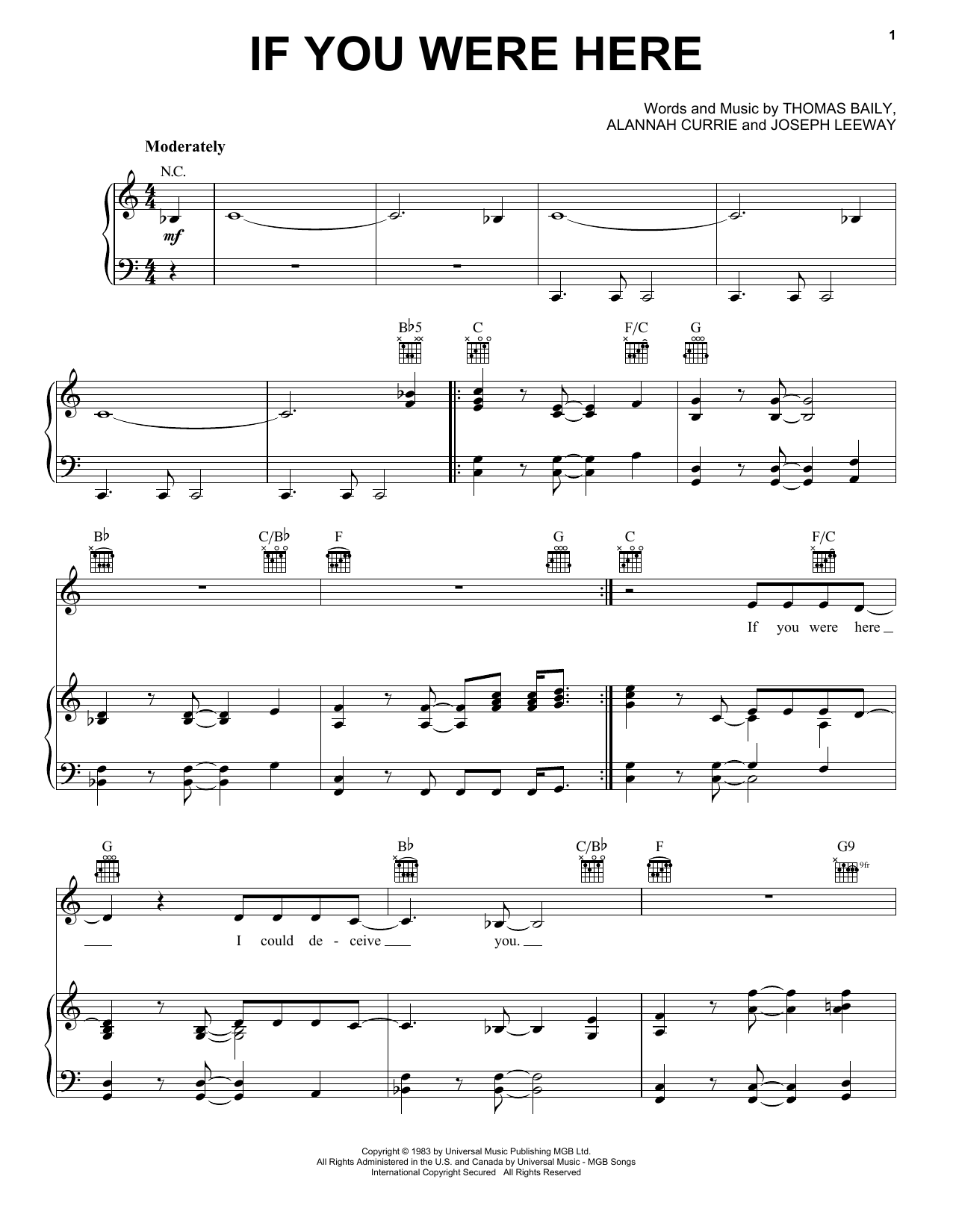 Download or print Alannah Currie If You Were Here sheet music, chords and digital score arranged for Piano, Vocal & Guitar Chords (Right-Hand Melody). This Pop score includes 6 page(s).