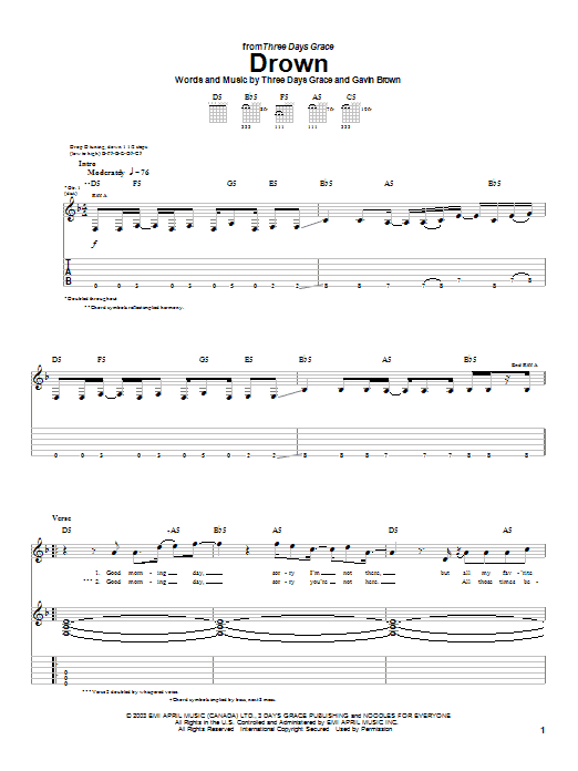 Download or print Three Days Grace Drown sheet music, chords and digital score arranged for Guitar Tab. This Rock score includes 5 page(s).