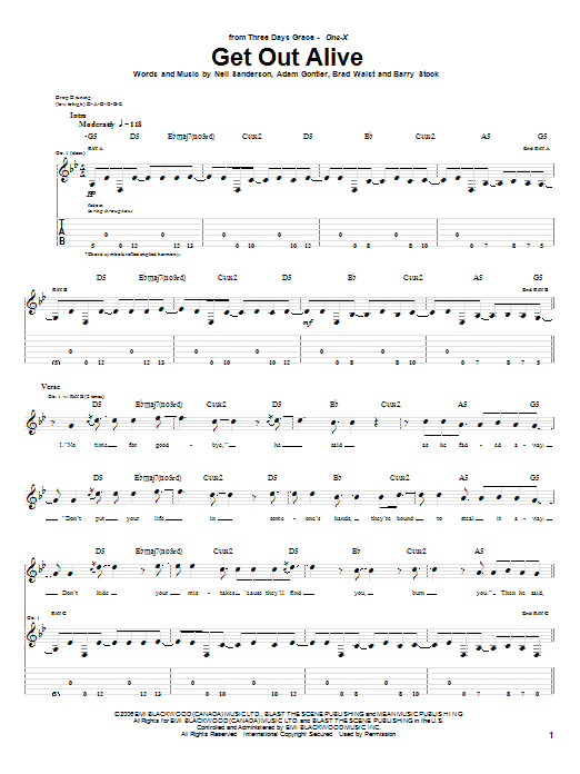 Download or print Three Days Grace Get Out Alive sheet music, chords and digital score arranged for Guitar Tab. This Metal score includes 7 page(s).