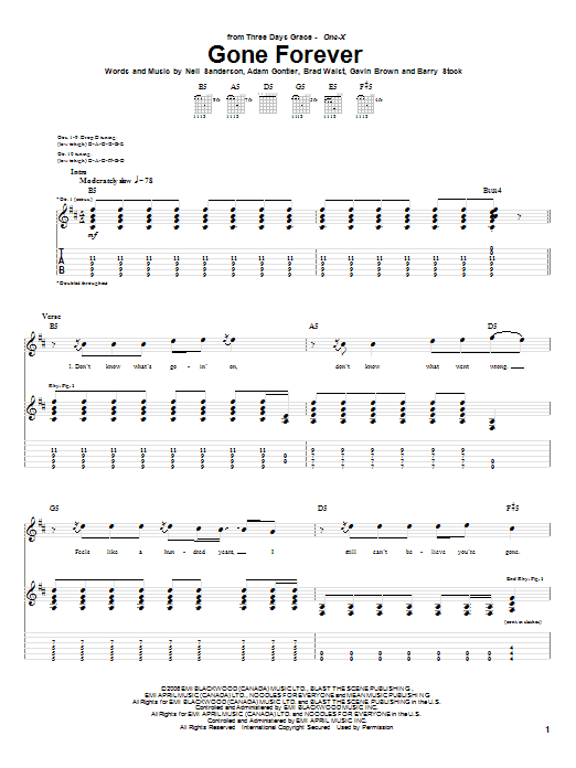 Download or print Three Days Grace Gone Forever sheet music, chords and digital score arranged for Guitar Tab. This Metal score includes 8 page(s).