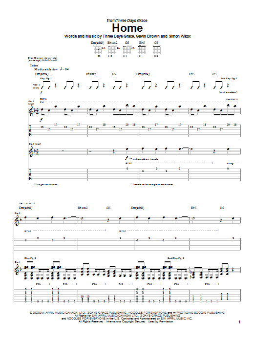 Download or print Three Days Grace Home sheet music, chords and digital score arranged for Guitar Tab. This Rock score includes 5 page(s).
