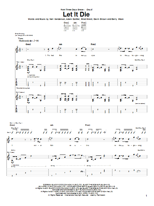 Download or print Three Days Grace Let It Die sheet music, chords and digital score arranged for Guitar Tab. This Metal score includes 6 page(s).