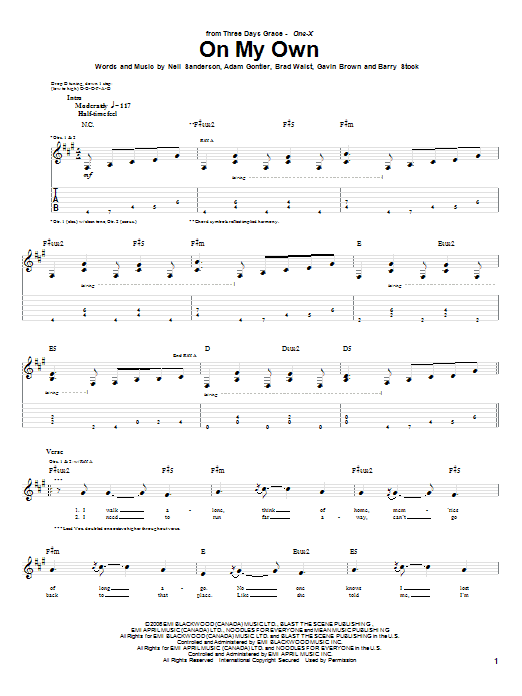 Download or print Three Days Grace On My Own sheet music, chords and digital score arranged for Guitar Tab. This Metal score includes 5 page(s).
