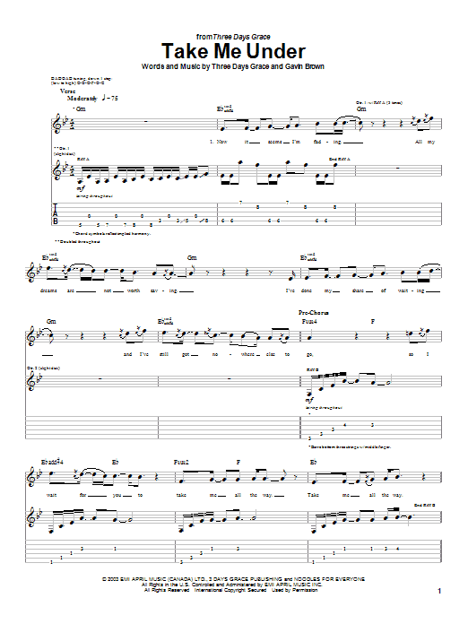 Download or print Three Days Grace Take Me Under sheet music, chords and digital score arranged for Guitar Tab. This Rock score includes 5 page(s).