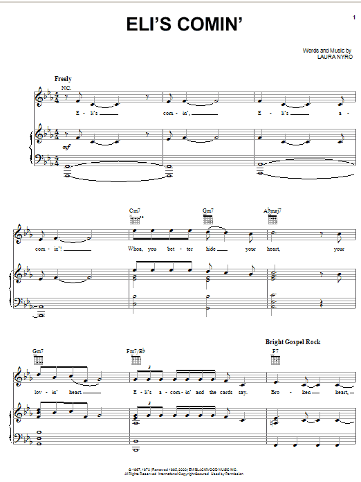 Download or print Three Dog Night Eli's Comin' sheet music, chords and digital score arranged for Lead Sheet / Fake Book. This Pop score includes 1 page(s).