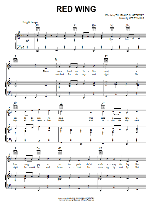Download or print Thurland Chattaway Red Wing sheet music, chords and digital score arranged for Piano, Vocal & Guitar Chords (Right-Hand Melody). This Blues score includes 3 page(s).