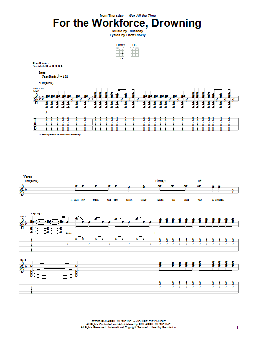 Download or print Thursday For The Workforce, Drowning sheet music, chords and digital score arranged for Guitar Tab. This Rock score includes 12 page(s).