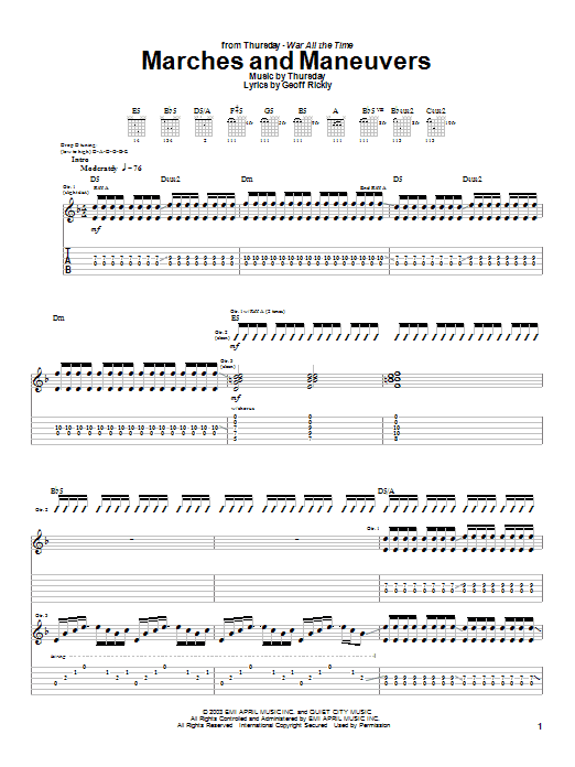 Download or print Thursday Marches And Maneuvers sheet music, chords and digital score arranged for Guitar Tab. This Rock score includes 11 page(s).