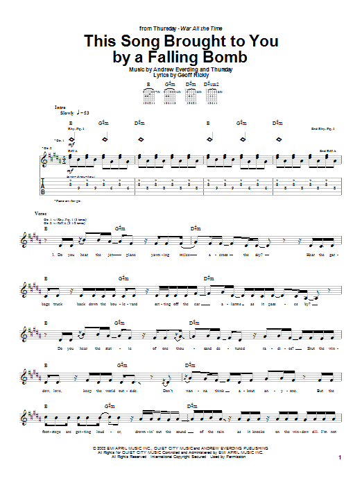 Download or print Thursday This Song Brought To You By A Falling Bomb sheet music, chords and digital score arranged for Guitar Tab. This Rock score includes 2 page(s).