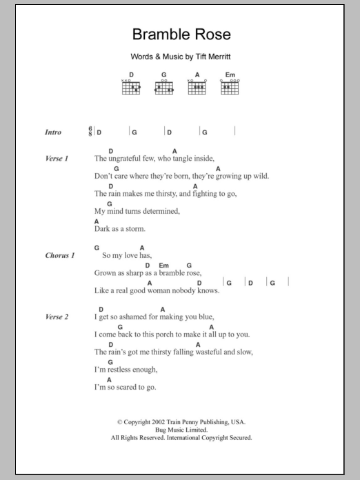 Download or print Tift Merritt Bramble Rose sheet music, chords and digital score arranged for Guitar Chords/Lyrics. This Country score includes 2 page(s).
